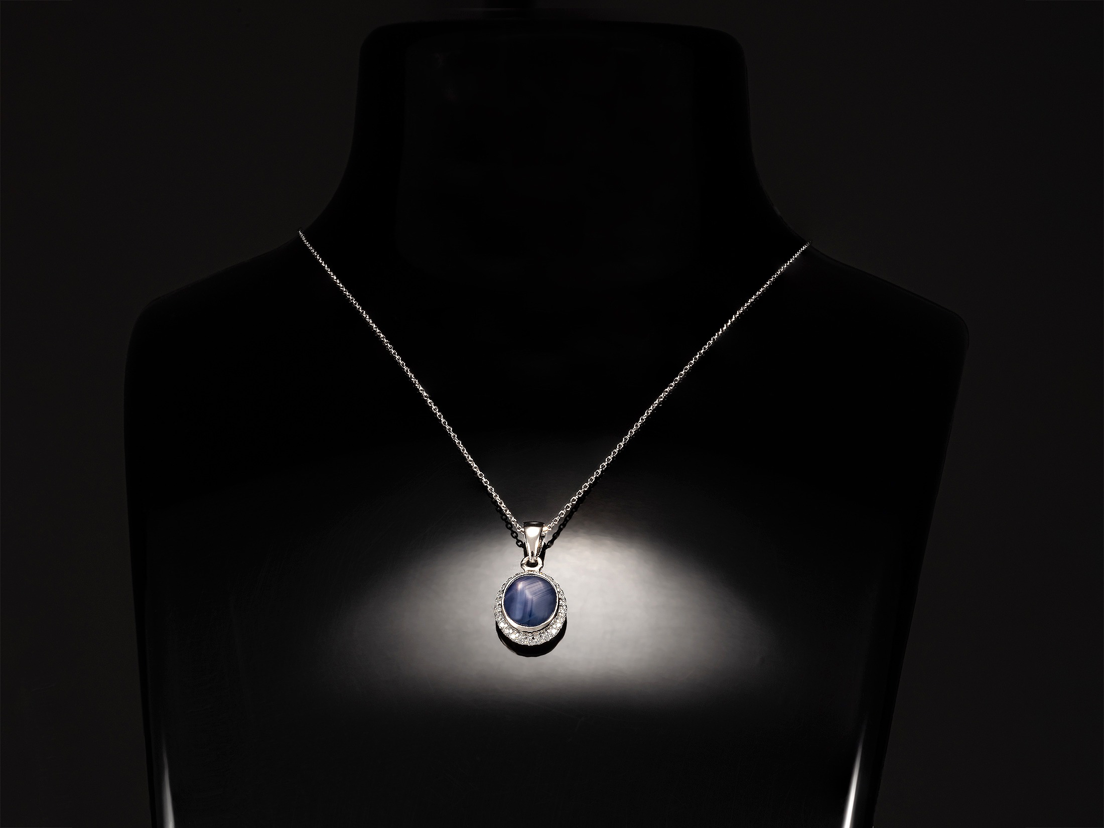 Lant de dama din aur alb de 14k cu pandant cu diamante albe si albastre in total